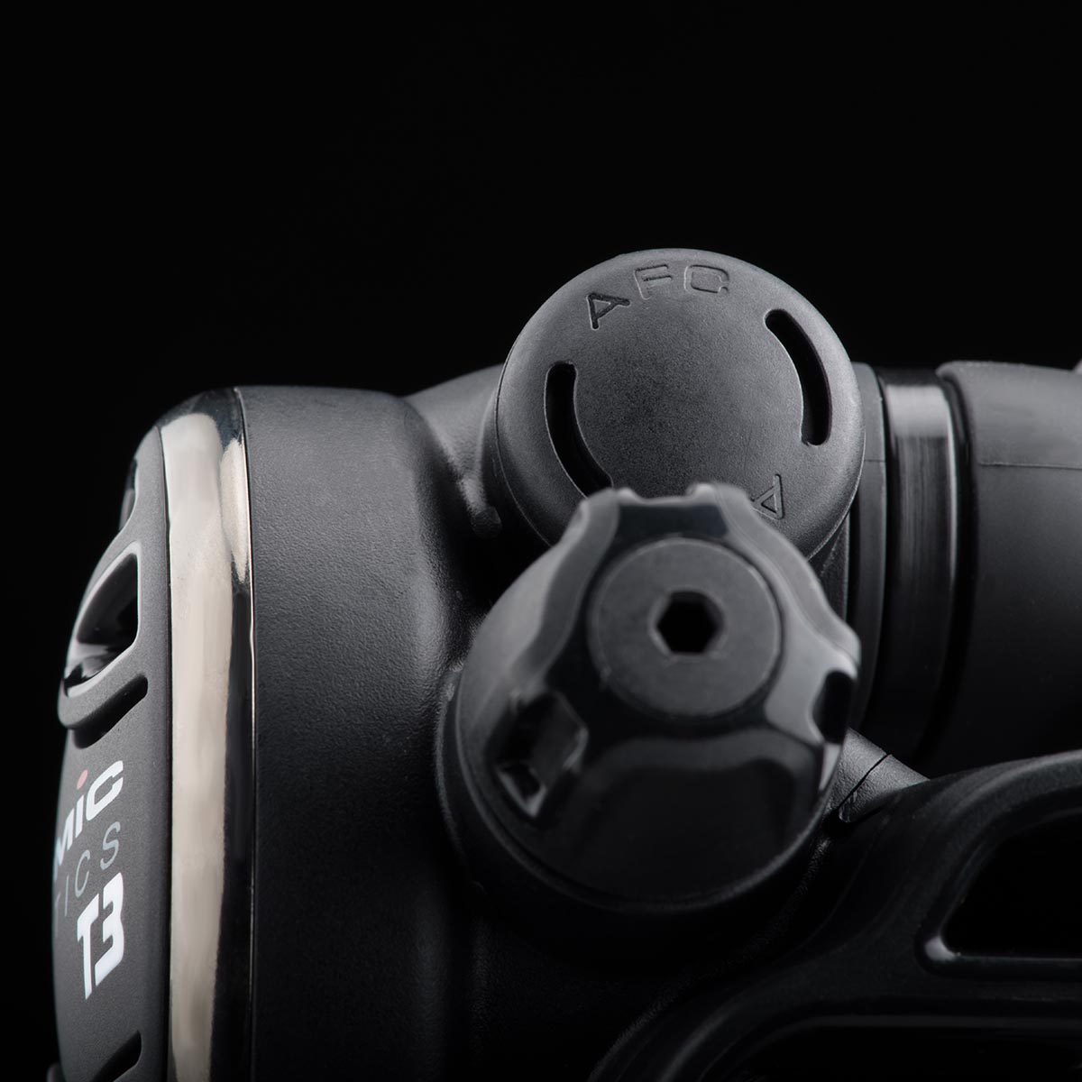 - Pneumatically-balanced poppet, high-flow case and lever design for easy breathing at all depths and tank pressures.Patented Atomic AFC – Automatic Flow Control.