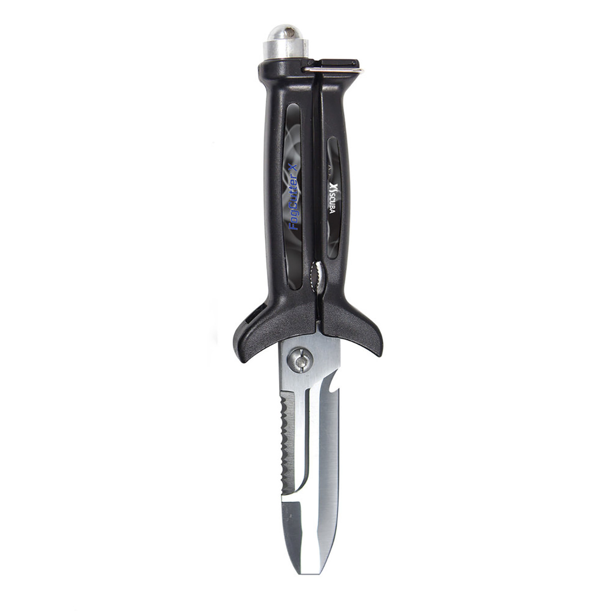 This Fogcutter X is actually three tools in one. Not only is it an effective, sharp knife, it also has sharp scissors and a serrated pipe grip integrated into it. The scissors are very effective for cutting monofilament, loose threads on wetsuits, excess webbing on harnesses and belts, just to name a few. The pipe grip can twist a stubborn nut or bolt. Get more work out of your dive knife.